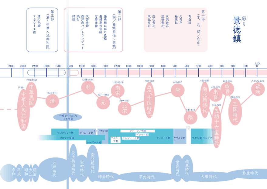 焼物が本格的に色づく中国明時代の嘉靖期と、新しい技術が生まれた清時代を区切りとして、第1期を嘉靖以前、第2期を嘉靖以後の明時代、そして第3期を清時代以降に分けました。